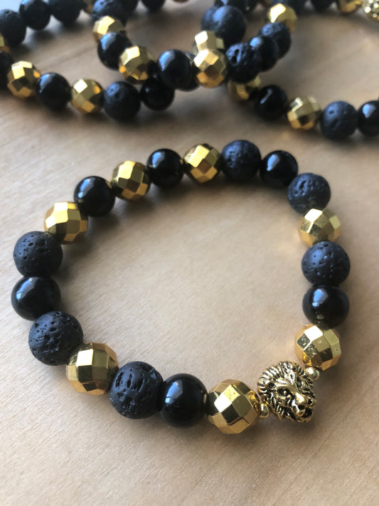 "Forza Et Honorum" - Onyx, Lava Stone, Hematite with Spacers and Lion Head Bead Stretch Bracelet
